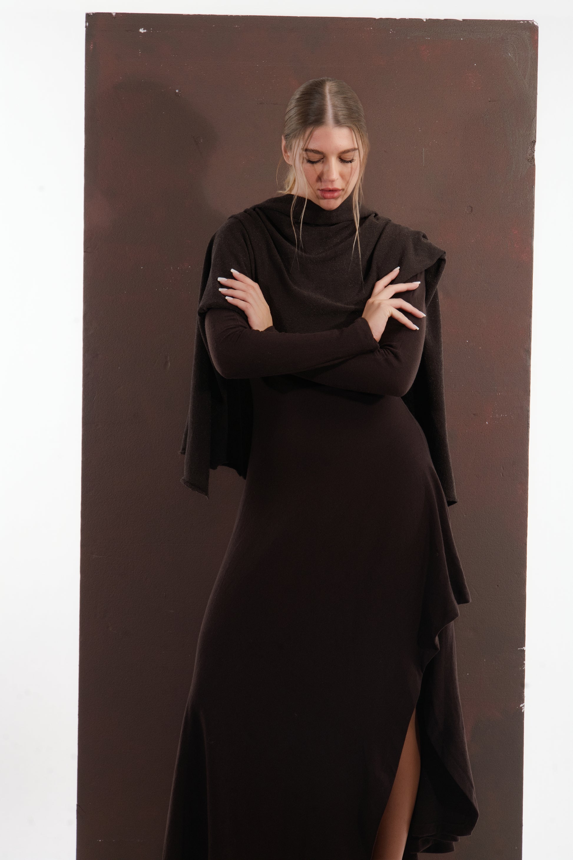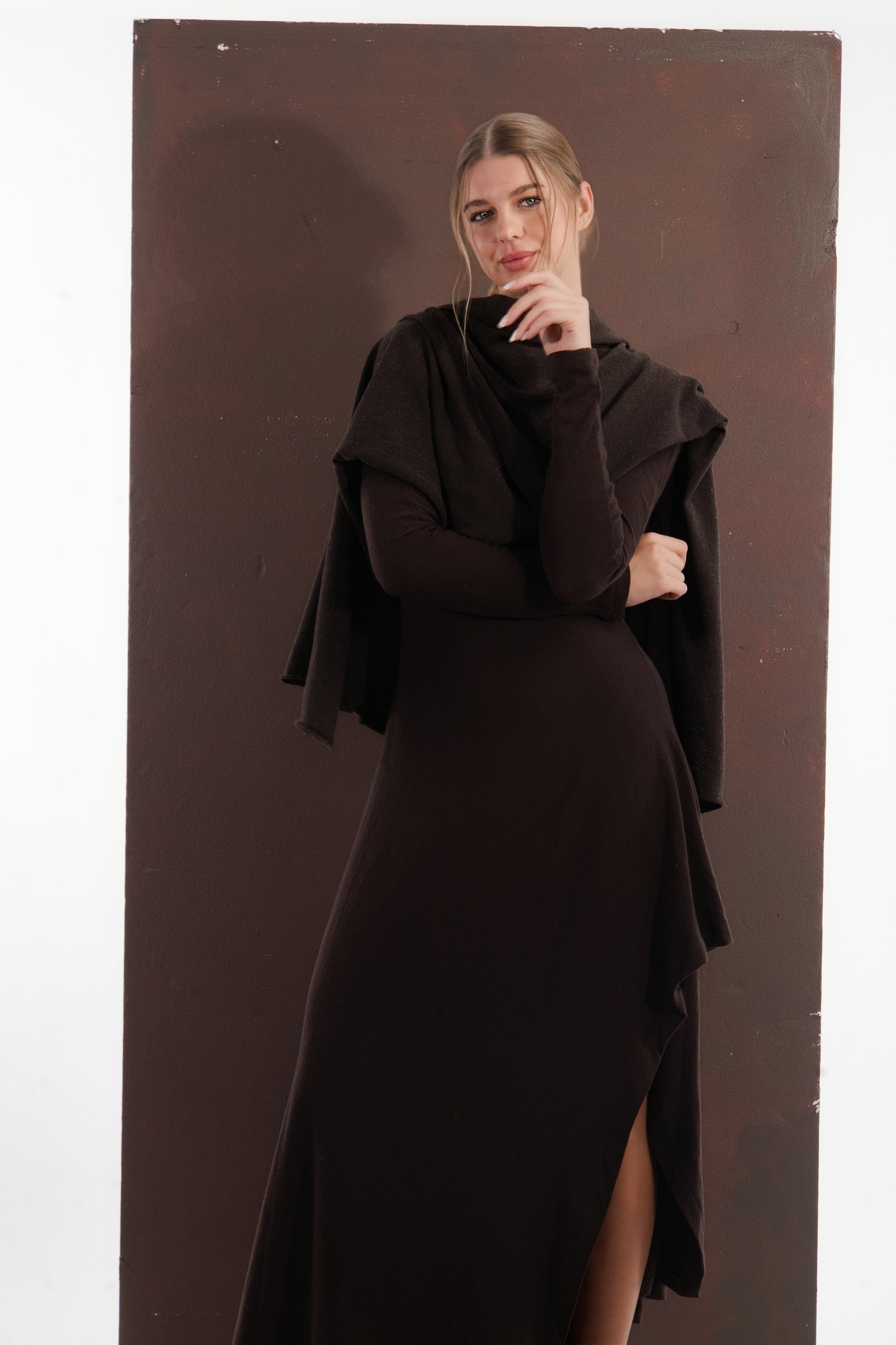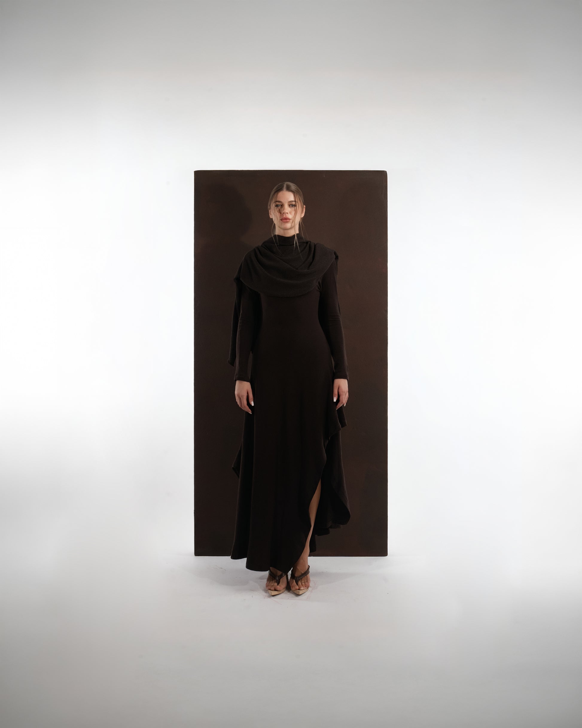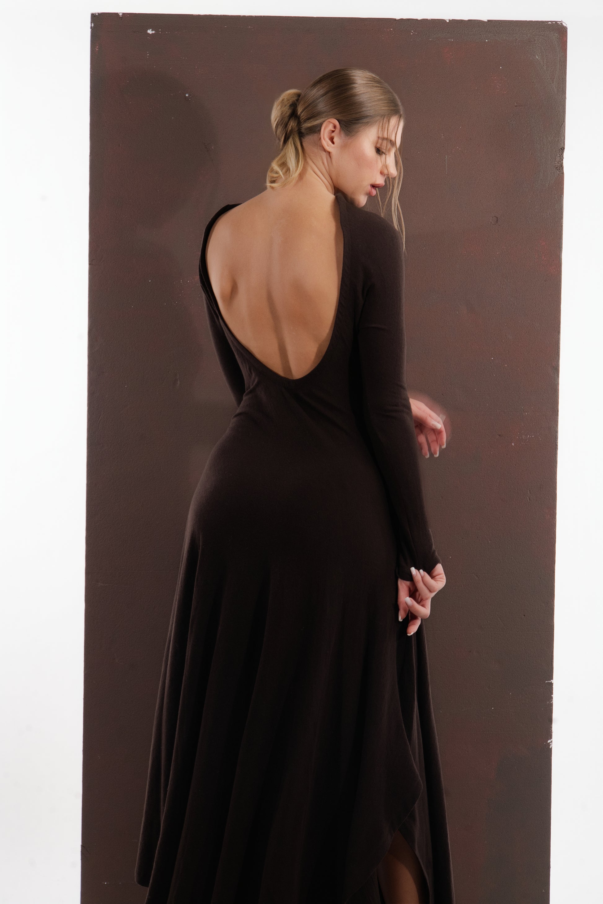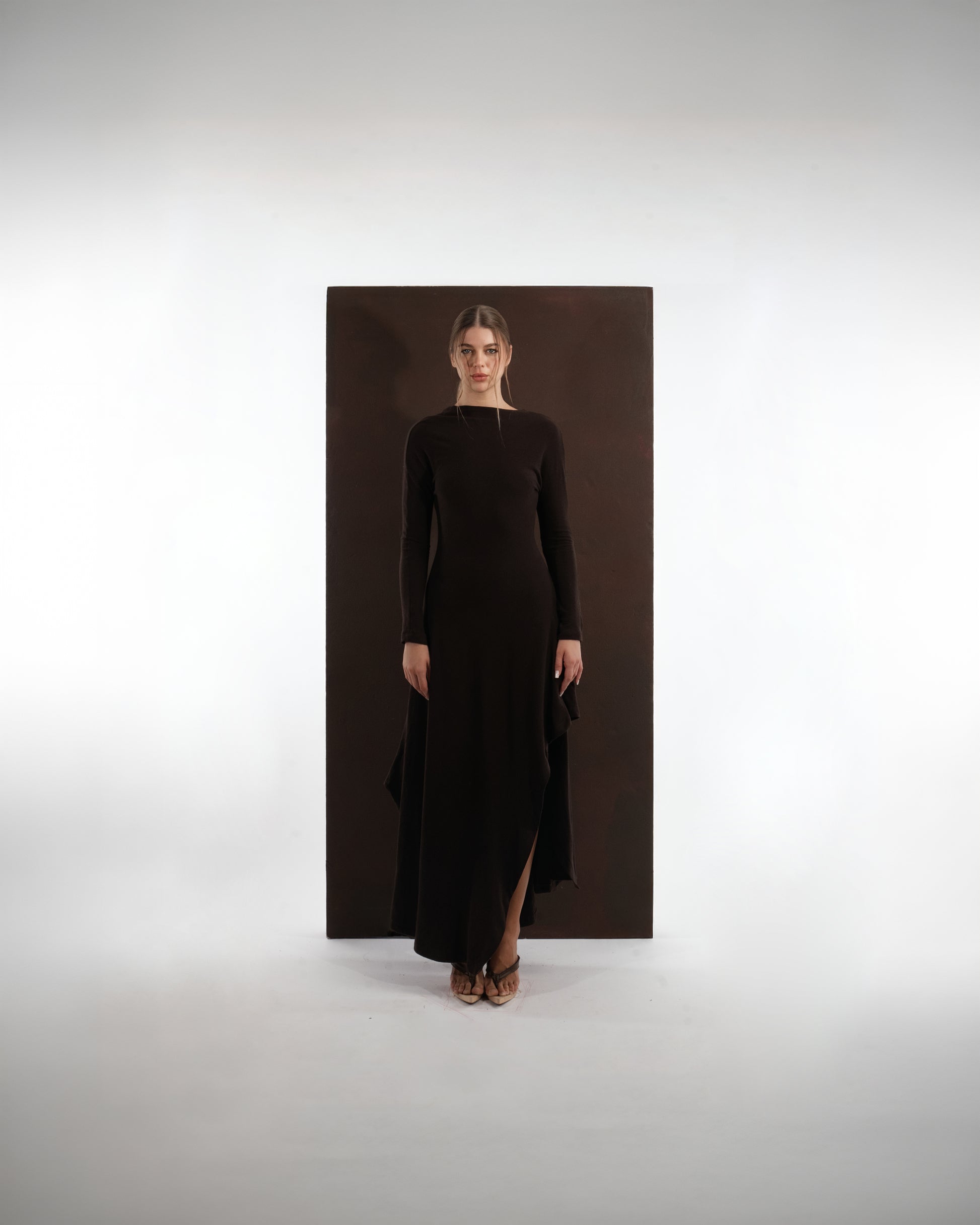 This wool-blend dress in deep brown embodies a balance of elegance and allure. Its sculptural drape cascades effortlessly, while the asymmetrical slit adds a modern edge to its fluid silhouette. The long sleeves provide refinement and balance, contrasting the daring open back that frames the body with graceful sensuality. Designed for both comfort and sophistication, this piece highlights the natural movement of the fabric, allowing it to flow with quiet drama. A timeless expression of understated luxury, perfect for evenings where presence is defined by subtle power and poise.