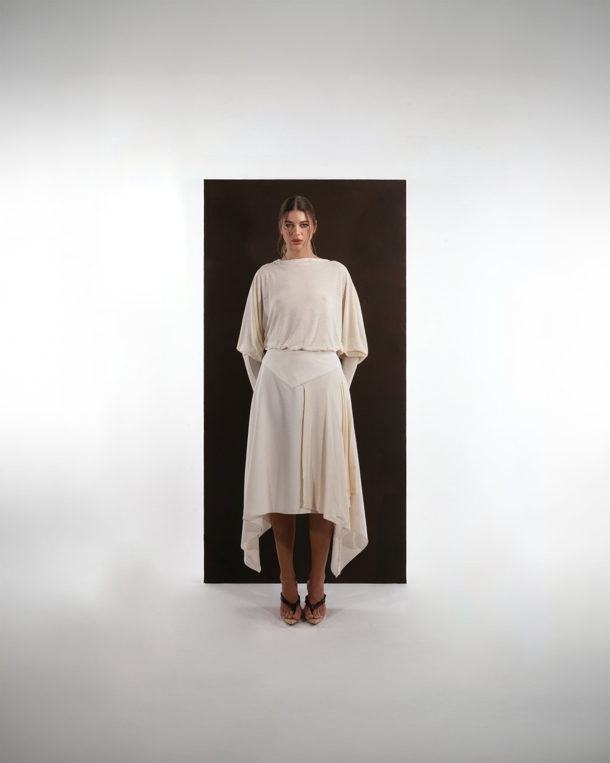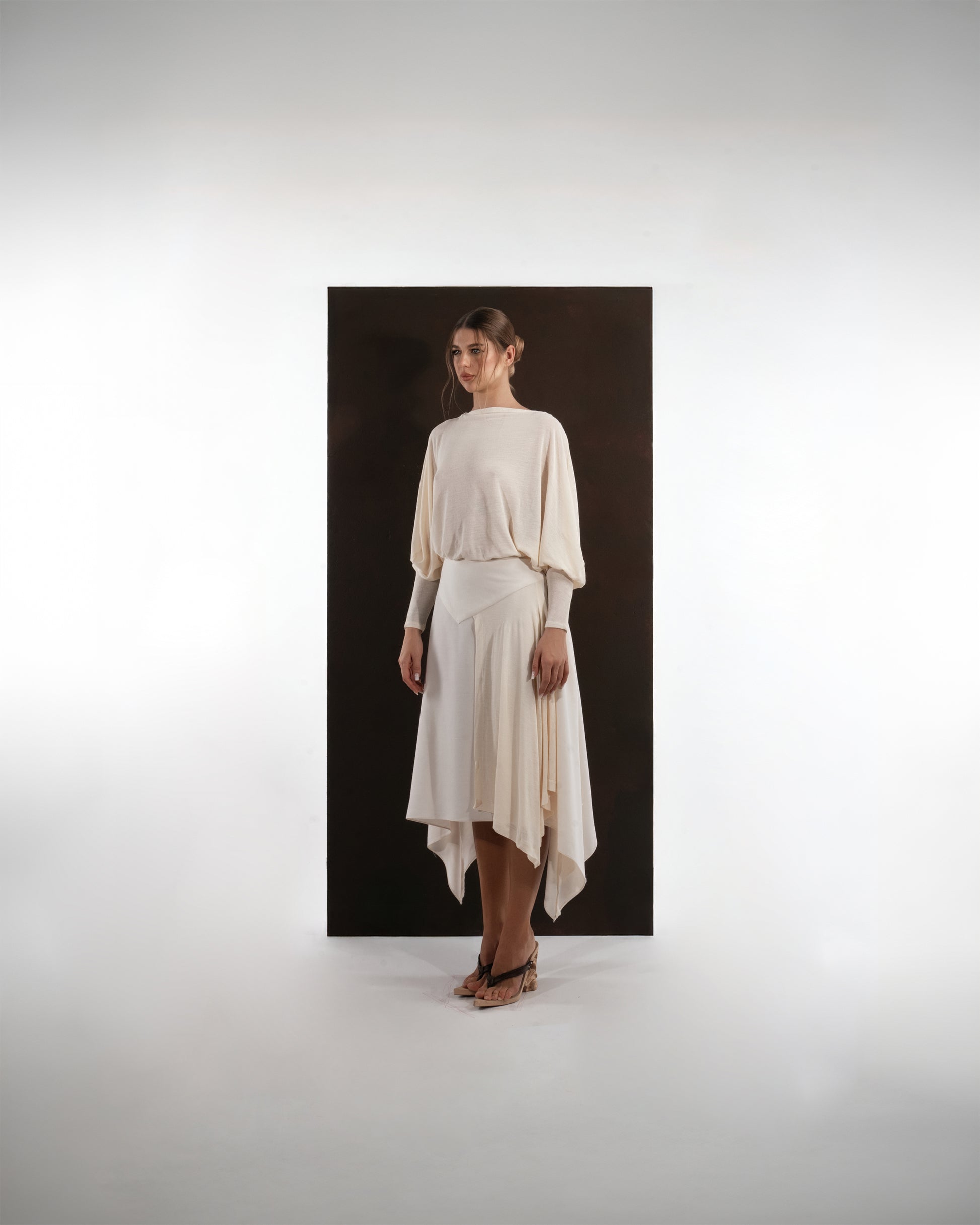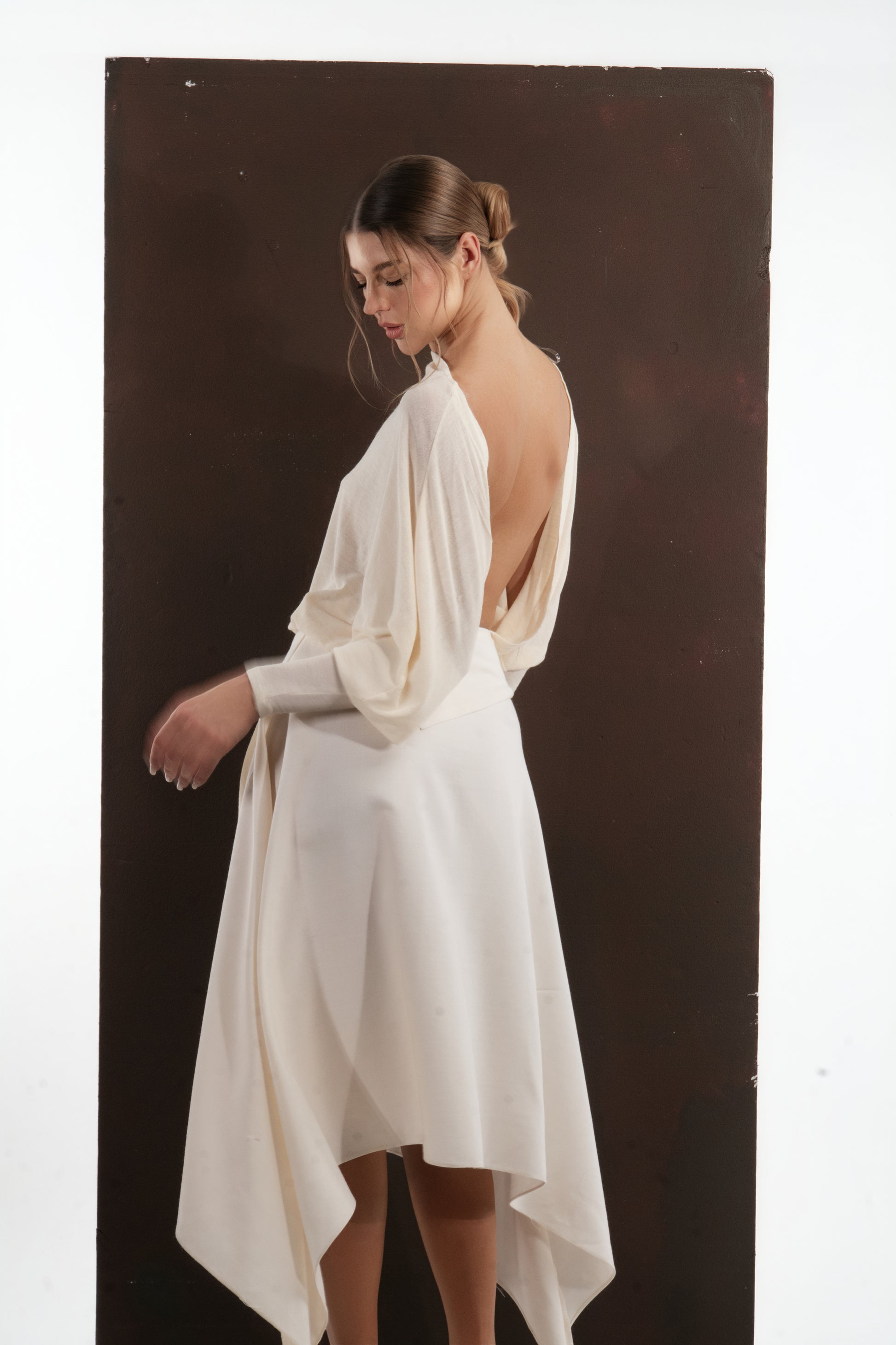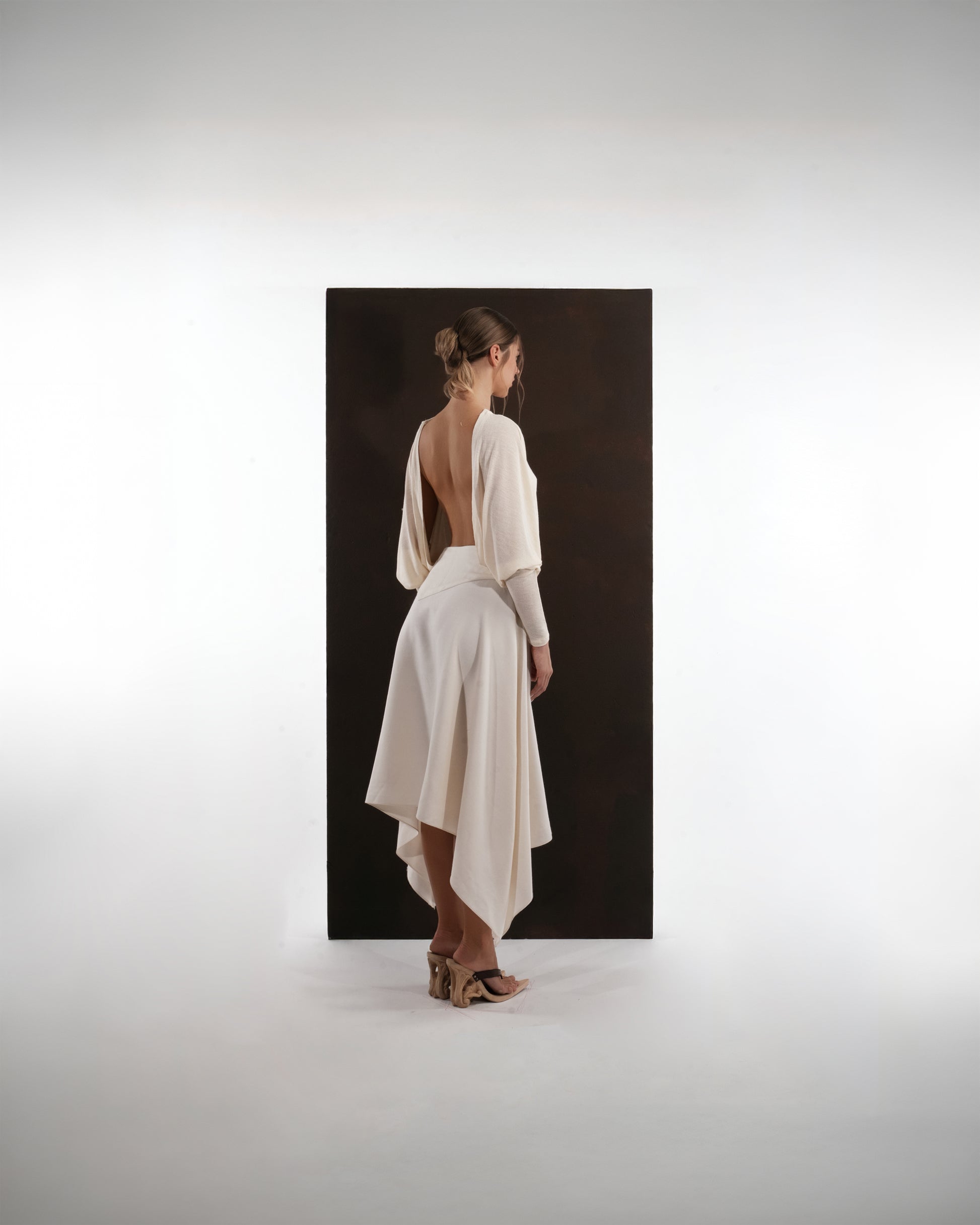 The true statement lies at the back: a daring open design that contrasts the modest front with striking sensuality. The plunging cut-out reveals the back in its entirety, framed by the fluidity of the wool-blend fabric, merging boldness with refinement. The natural cream tone enhances the fabric’s soft texture, highlighting its luxurious fall and subtle luster.
