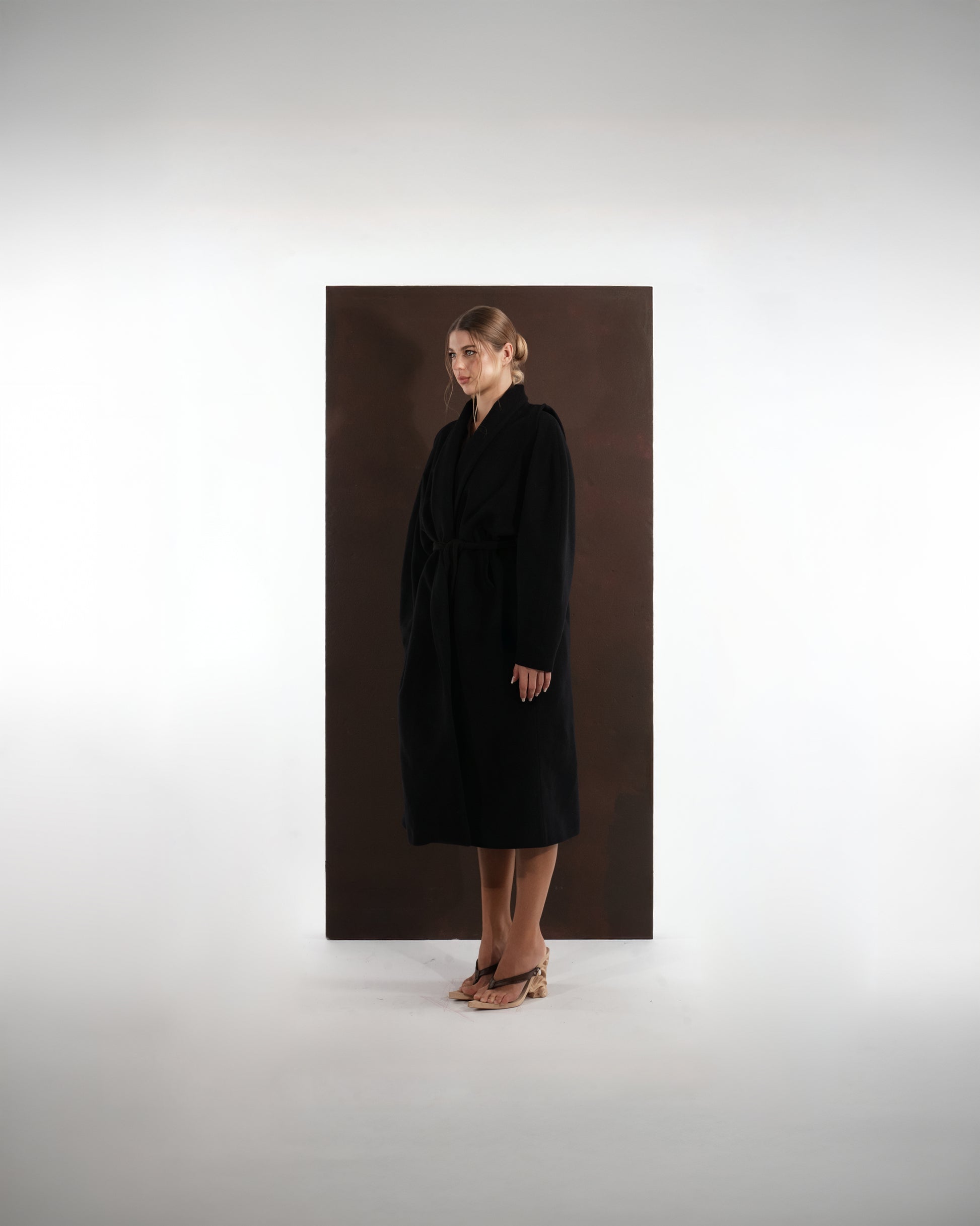 This long black coat, crafted from a premium wool blend, epitomizes understated refinement. Its clean lines and enveloping silhouette offer both warmth and elegance, while the belted waist subtly defines the figure without compromising its fluid drape. The oversized sleeves and shawl collar introduce a sculptural quality, balancing softness with quiet strength.