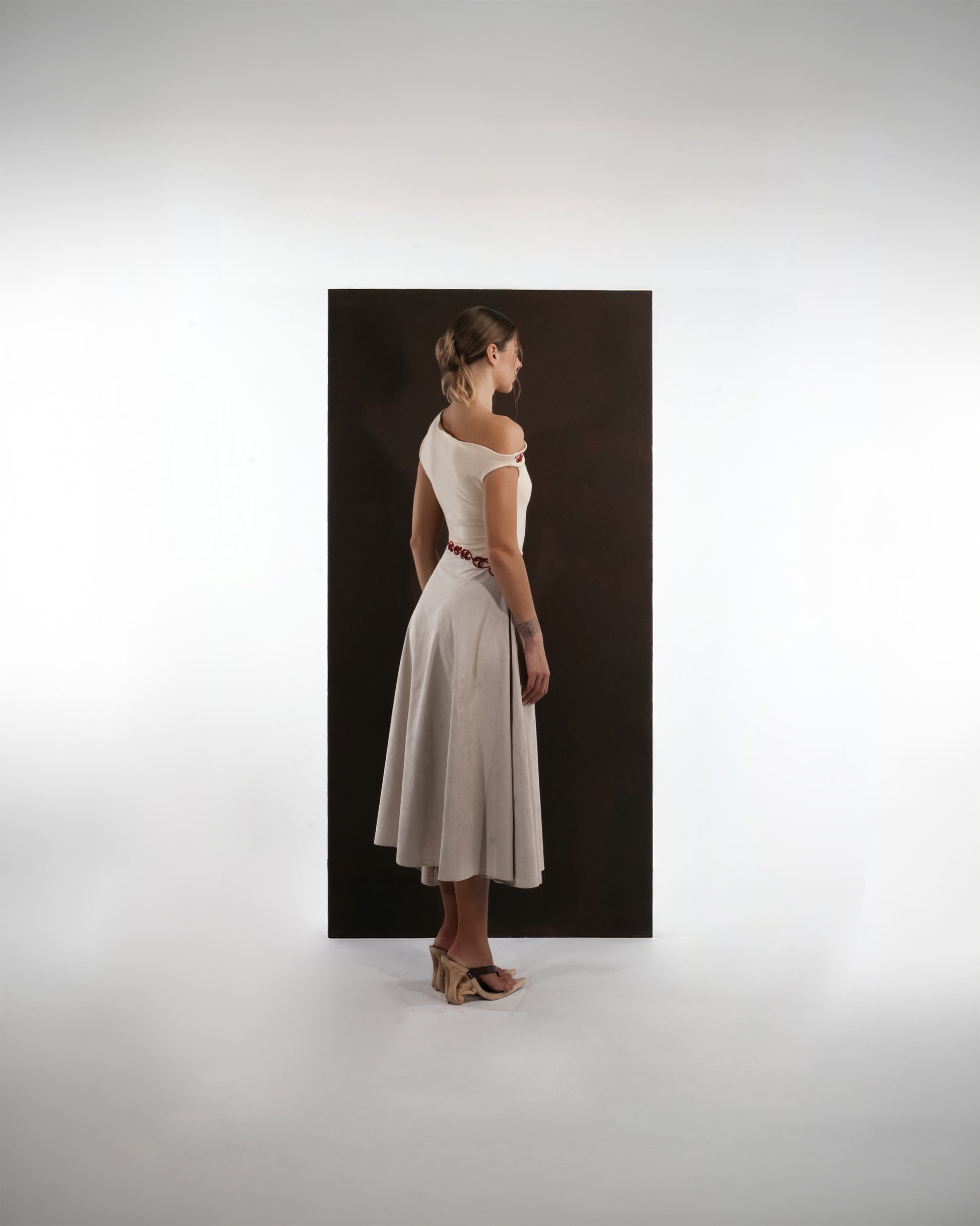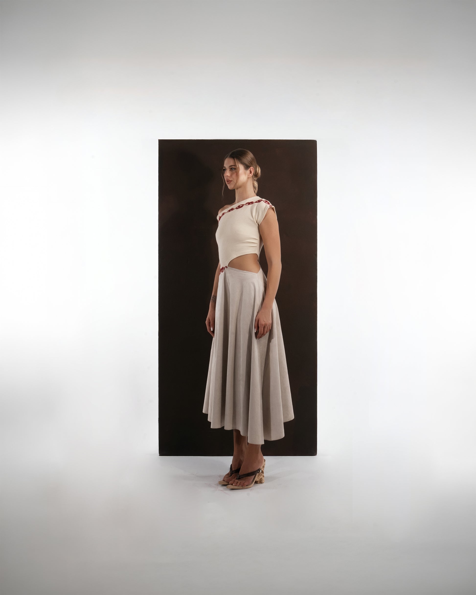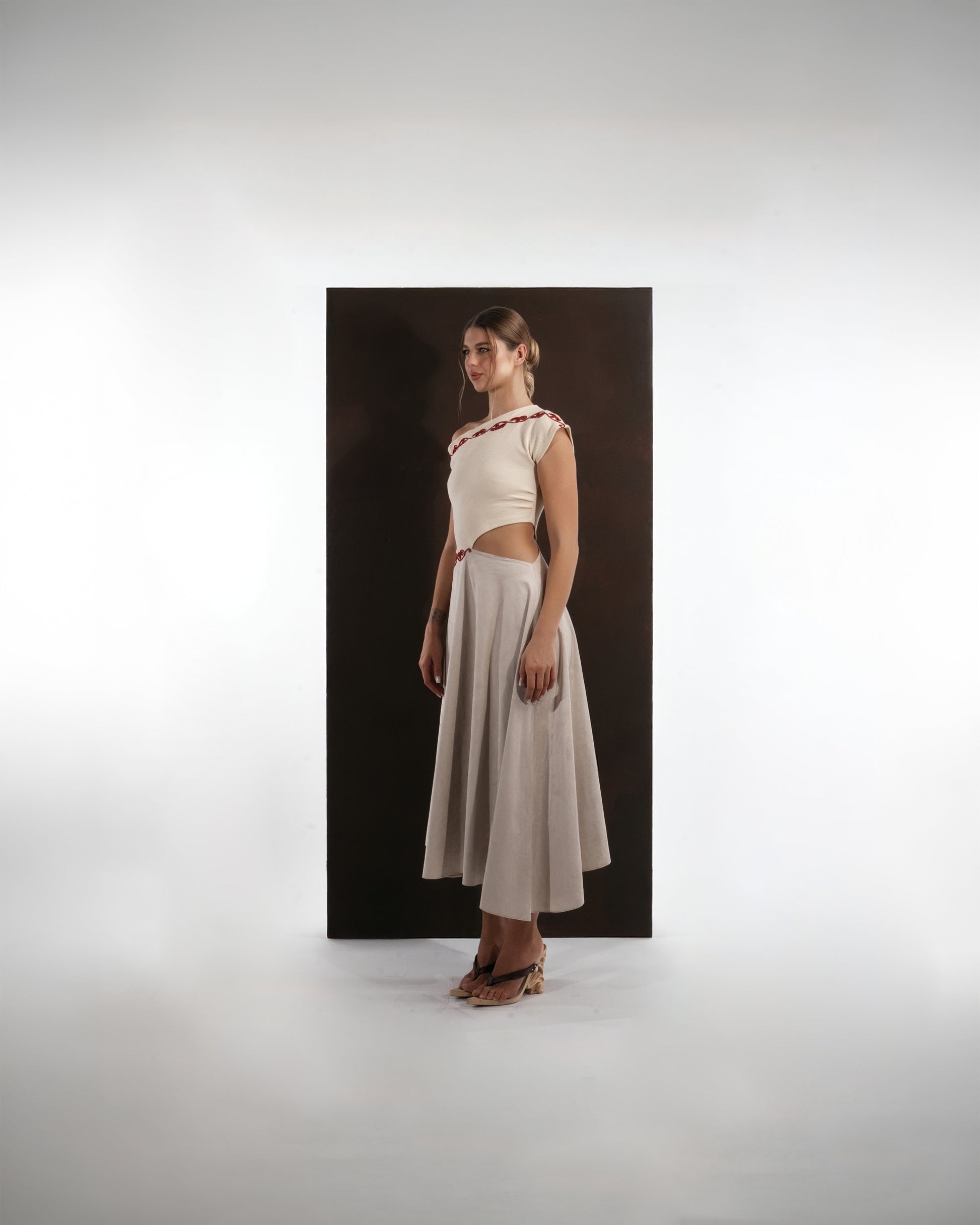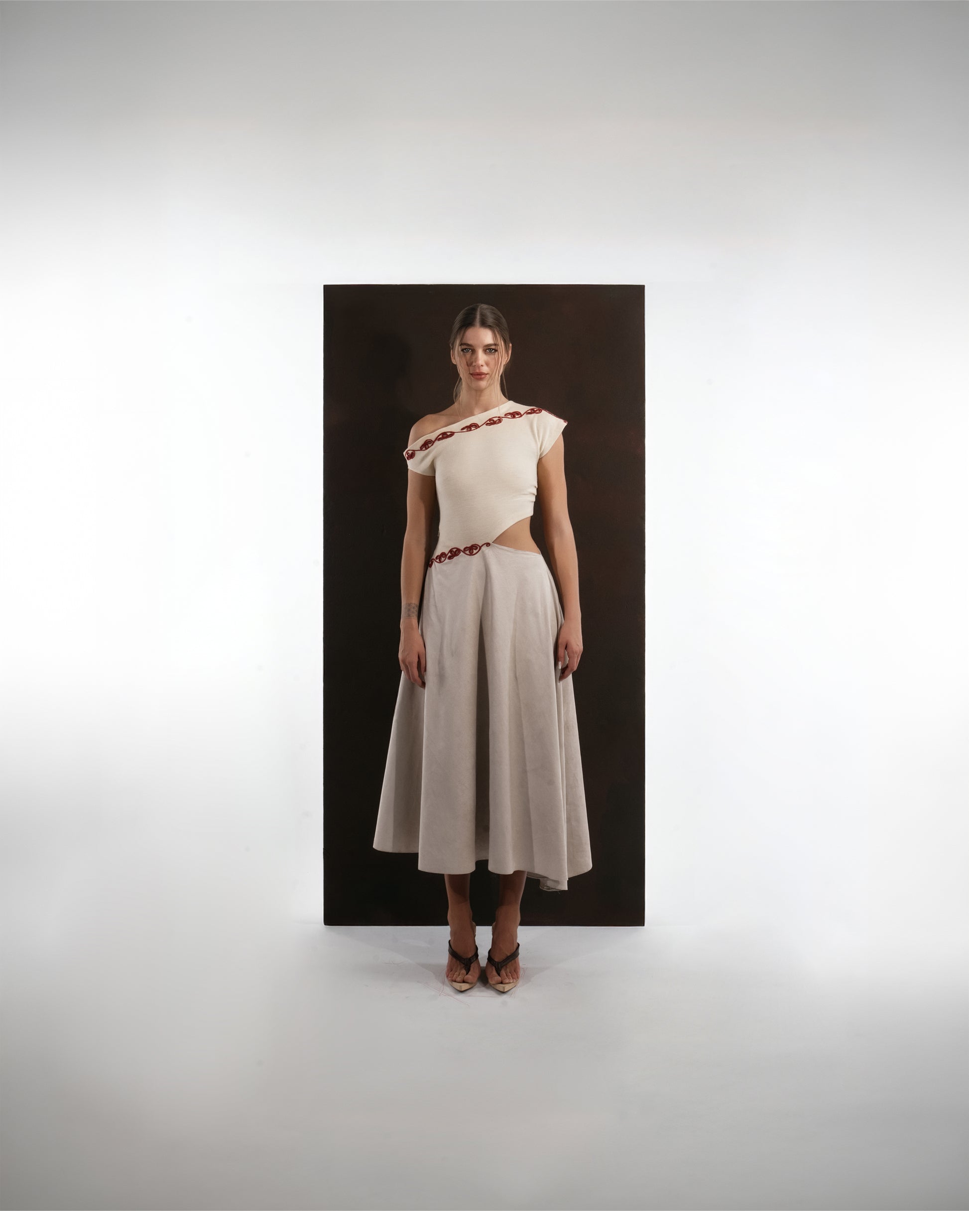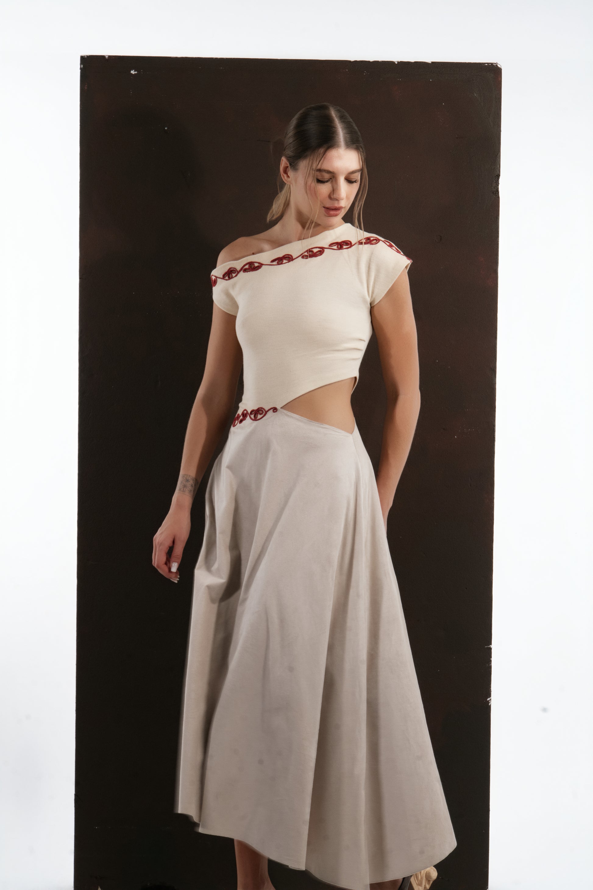 This dress captures the harmony between refined tailoring and artisanal craftsmanship. Cut from a soft wool blend, it pairs an asymmetrically draped top with a fluid, mid-length skirt that moves with effortless grace. The off-shoulder neckline lends a modern allure, balanced by the clean architectural lines of the silhouette.