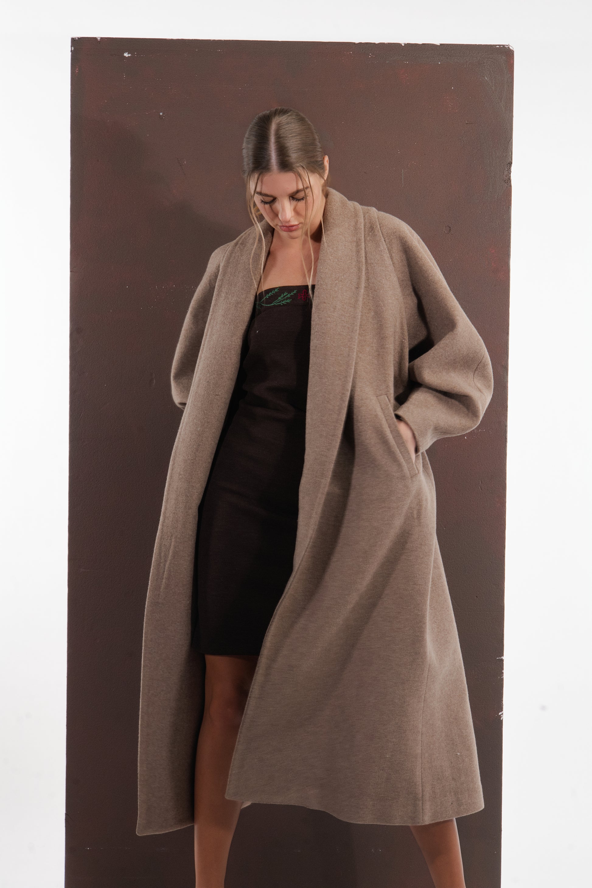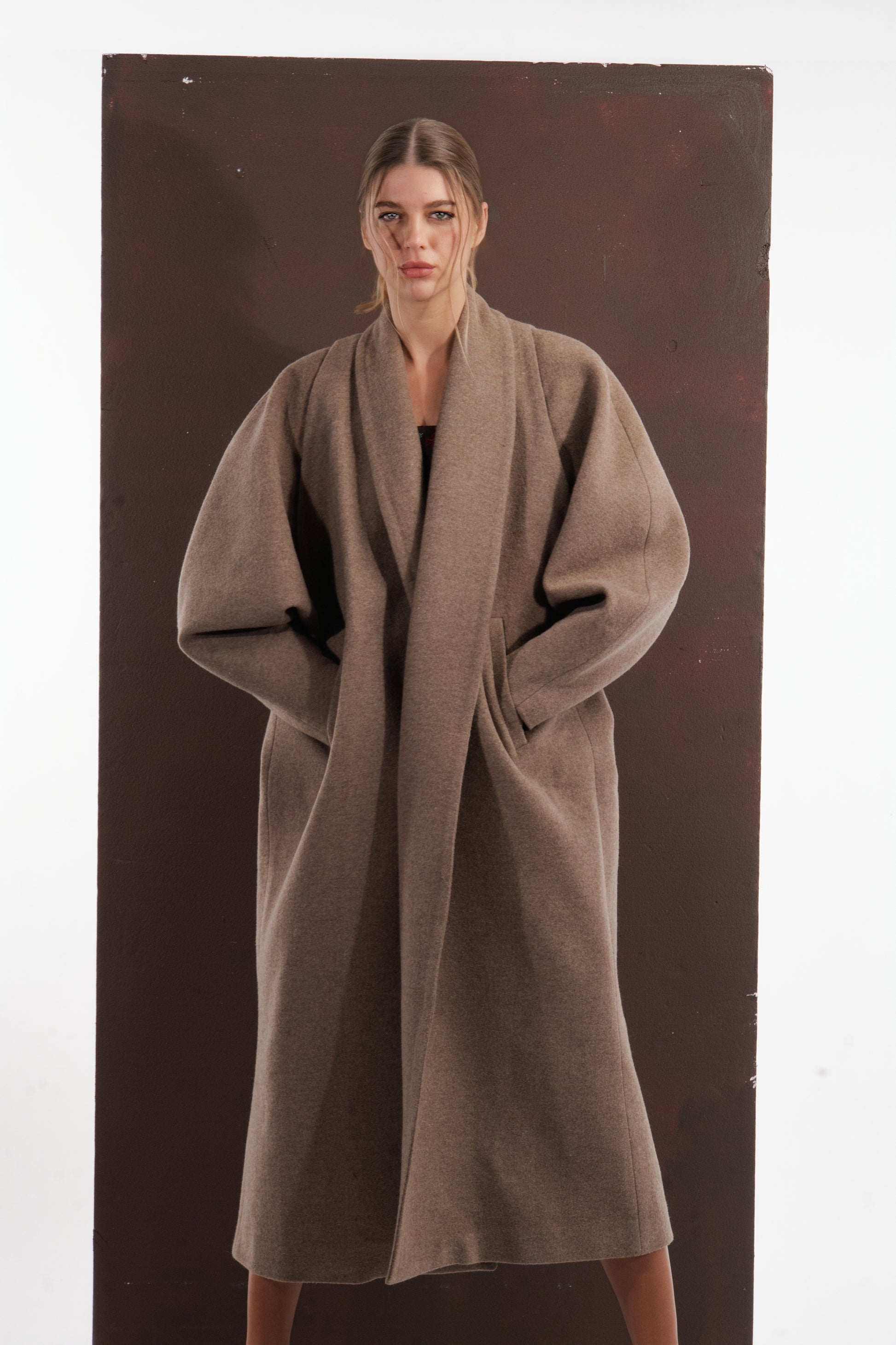 This wool-blend coat embodies understated luxury through its sculptural silhouette and refined minimalism. The design features voluminous sleeves that taper into clean lines, creating a balance between architectural presence and fluid ease. Its shawl-inspired collar drapes softly along the neckline, framing the wearer with quiet elegance.